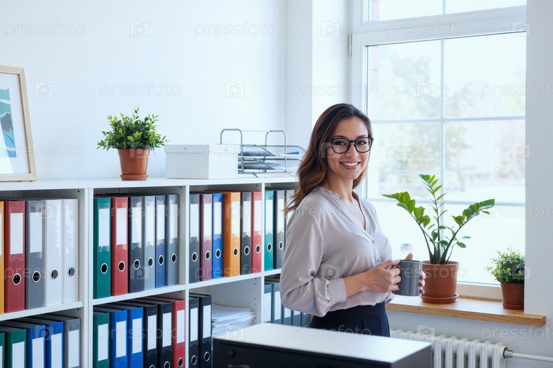 Портрет молодой взрослой белокожей женщины, улыбающейся в то время как она держит чашку кофе