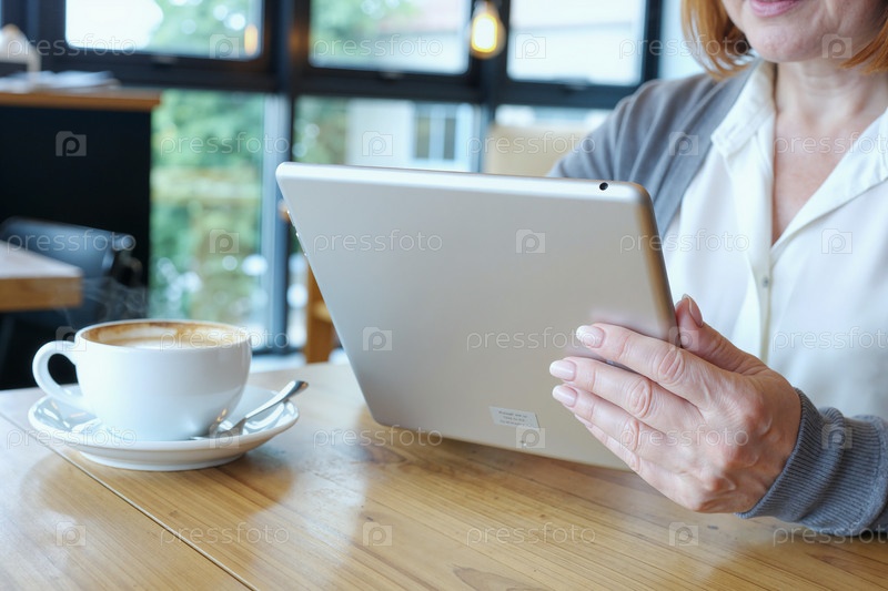 Белая женщина среднего возраста использует цифровой планшет, сидя в кафе