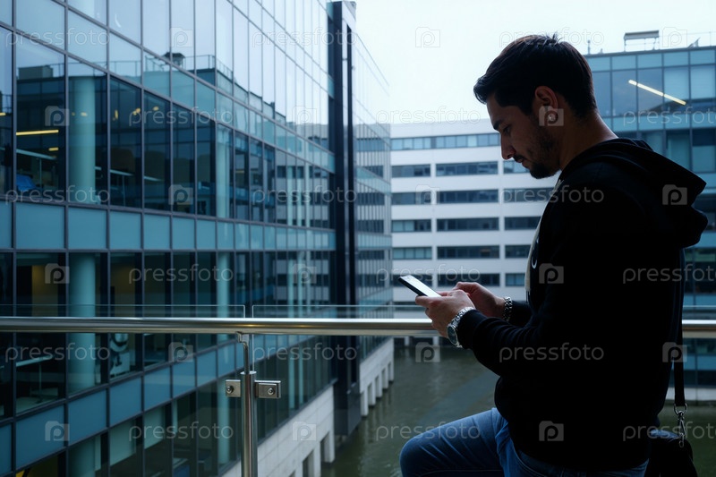 Молодой взрослый кавказский мужчина использует смартфон в современном офисном здании