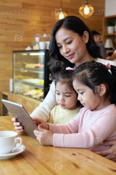 Молодая азиатская мать, сидящая с двумя дочерьми и использующая вместе цифровой планшет