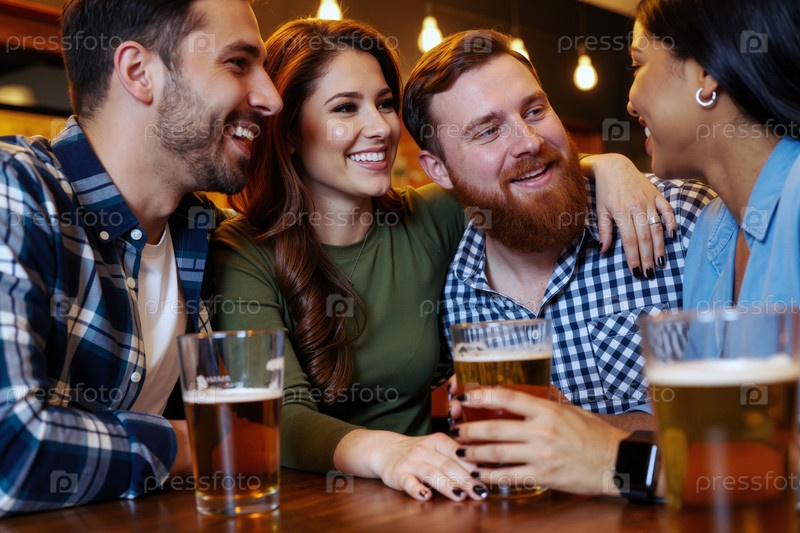 Группа друзей молодых взрослых, общаясь и смеясь за барным столом в помещении