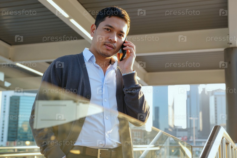 Портрет молодого взрослого азиатского мужчины, разговаривающего со смартфоном в городской обстановке