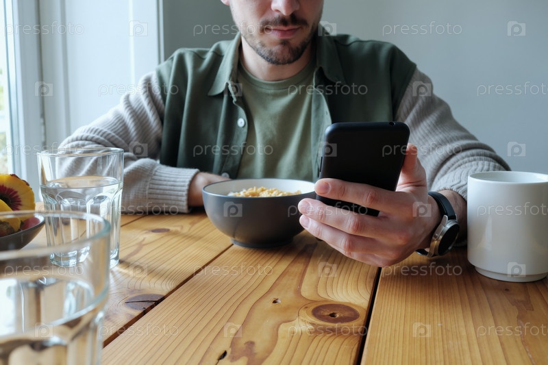 Молодой взрослый белый мужчина ест завтрак, используя смартфон за столом