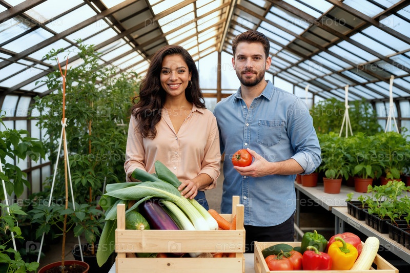 Молодой белый мужчина и молодая женщина собирают свежие овощи в теплице