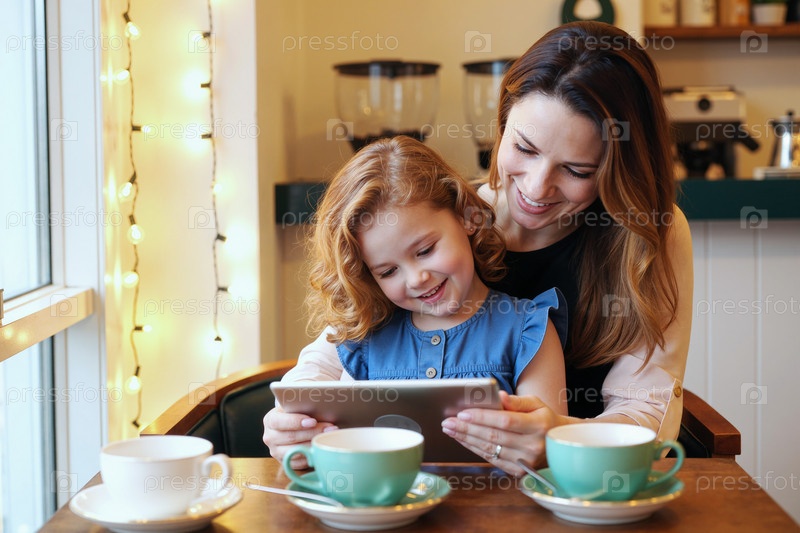 Кавказская молодая взрослая женщина помогает кавказской девочке-ребенку с помощью цифрового планшета