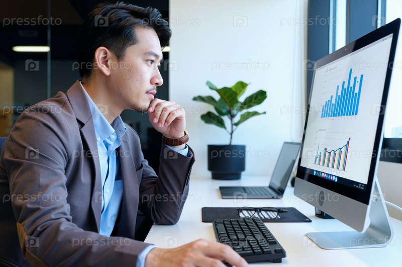 Молодой взрослый азиатский мужчина анализирует финансовые данные на компьютерном мониторе в офисе