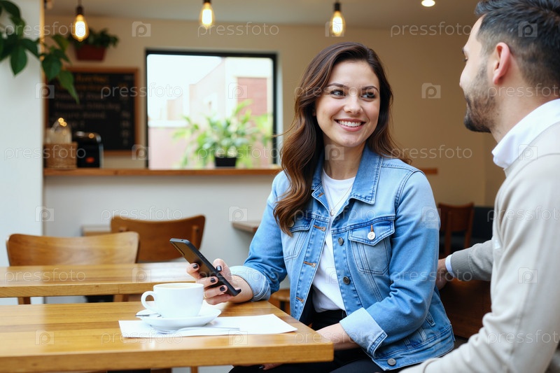 Белая женщина улыбается, разговаривая с молодым мужчиной в кафе