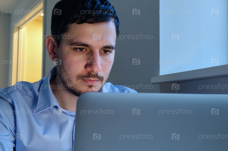 Портрет молодого взрослого белого мужчины, работающего на ноутбуке в офисной обстановке