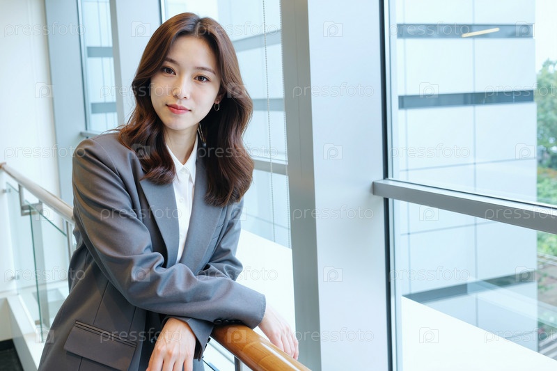 Портрет молодой взрослой азиатской женщины, опирающейся на перила в современном офисе