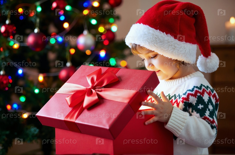 Кавказский ребенок, носящий шляпу Санты Открытие подаркового ящика возле рождественской елки