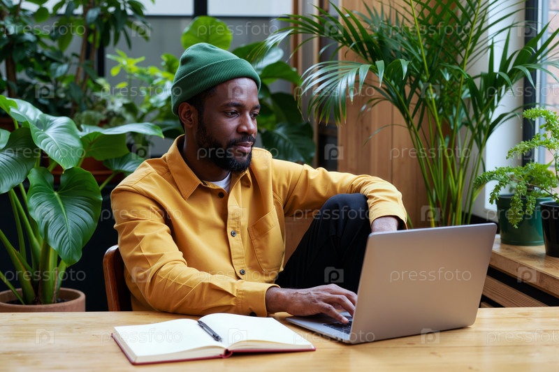Молодой взрослый чернокожий мужчина работает на ноутбуке в современном домашнем офисе, окруженный растениями