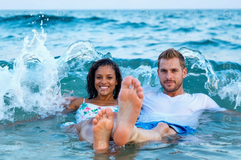 Молодой белый мужчина и молодая чернокожая женщина отдыхают вместе на океанских волнах