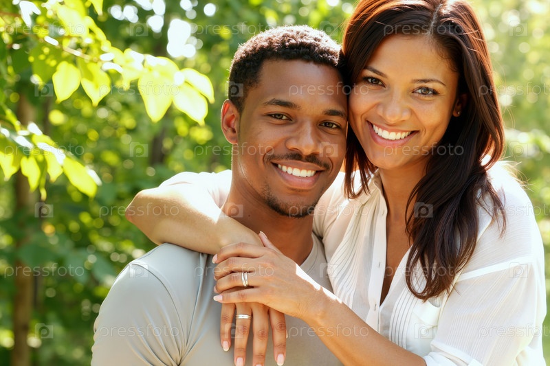 Портрет молодой взрослой пары, улыбающейся и обнимающей природу