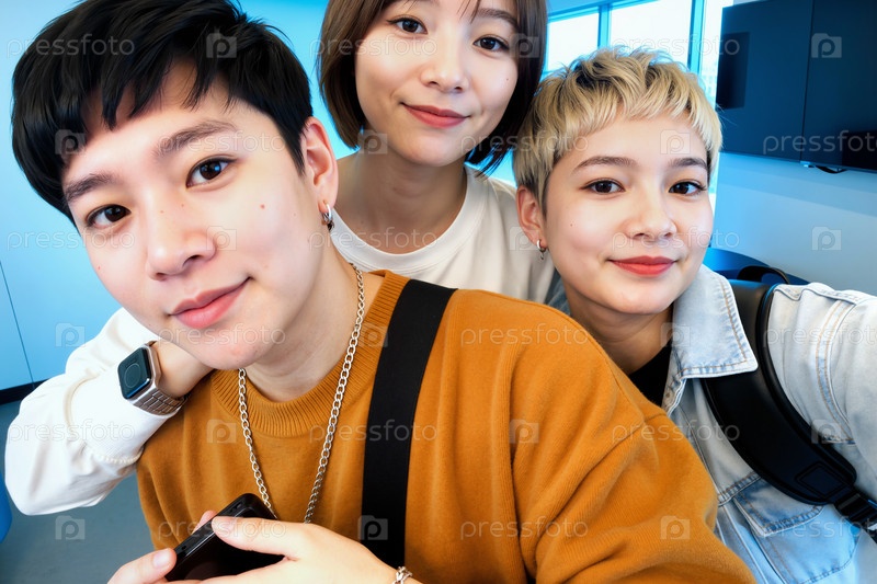 Группа молодых взрослых азиатских друзей, улыбающихся и позирующих для селфи в помещении