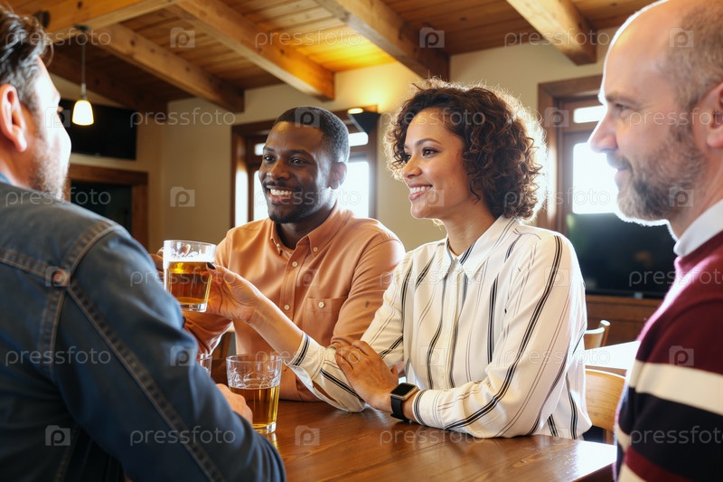 Мультиэтнические люди общаются и пьют пиво за деревянным столом в помещении