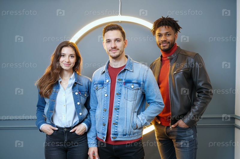 Стильные молодые взрослые, стоящие вместе и улыбающиеся в современной обстановке студии