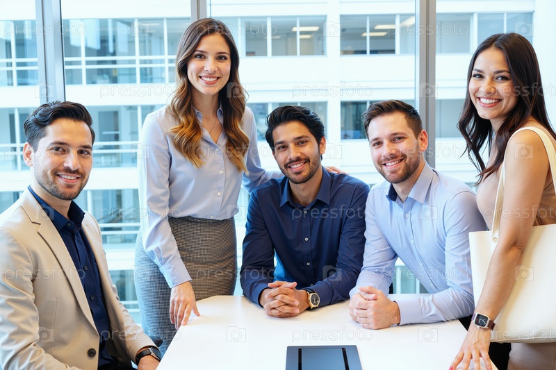 Группа молодых коллег-взрослых, улыбающихся во время офисной встречи