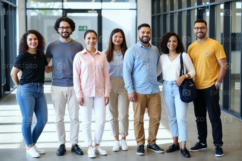 Разнообразная группа молодых взрослых, улыбающихся и стоящих вместе в помещении