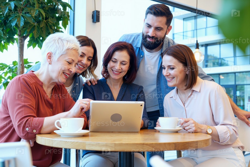 Группа белых женщин среднего возраста и молодого человека, улыбающихся при использовании цифрового планшета