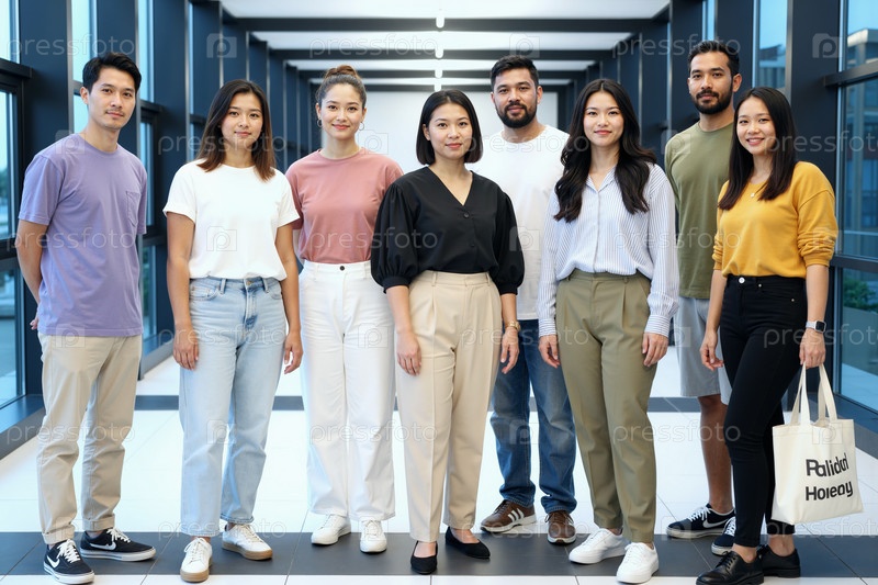 Группа молодых взрослых азиатских людей, стоящих в современном коридоре