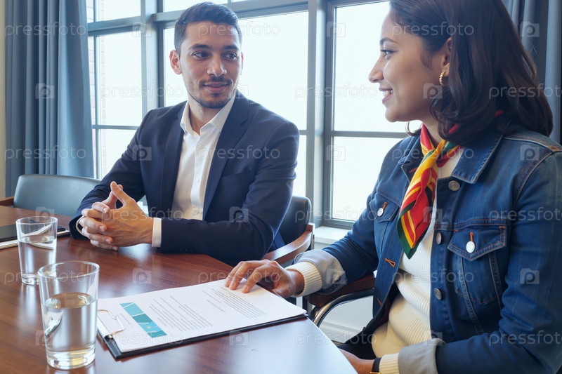 Молодой белый мужчина и молодая латиноамериканская женщина обсуждают деловые документы вместе