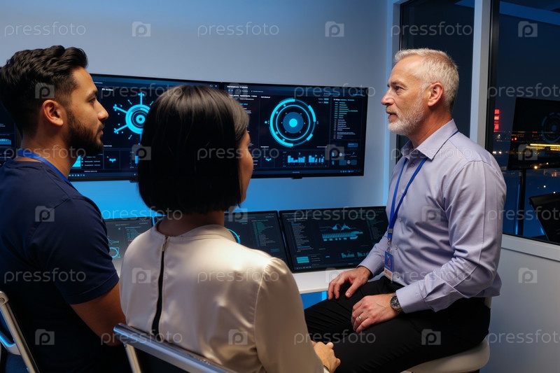 Кавказский мужчина средних лет объясняет анализ данных молодой мультиэтнической команде