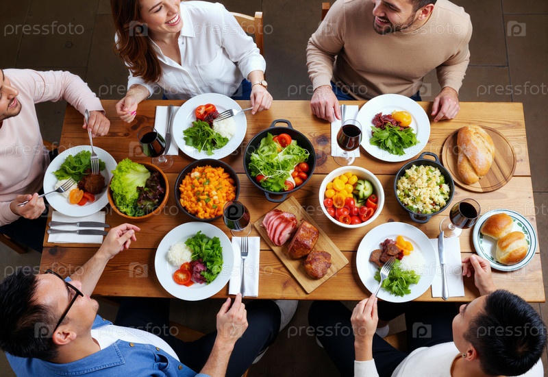 Разнообразная группа молодых взрослых наслаждаются ужином вместе за деревянным столом