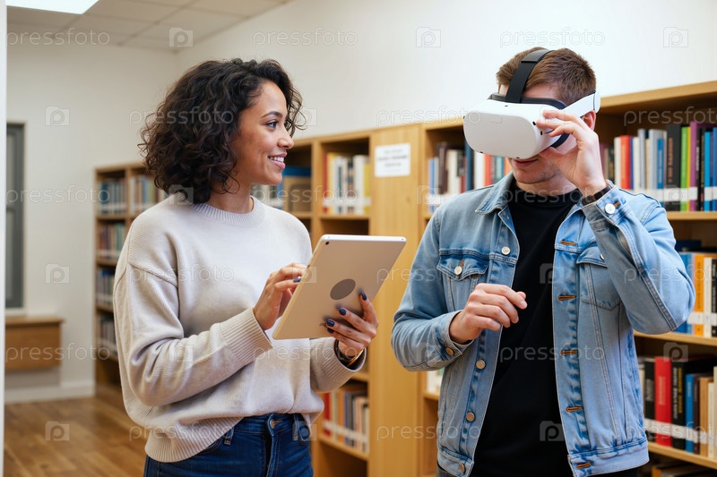 Юный кавказский мужчина использует гарнитуру виртуальной реальности с помощью молодой чернокожей женщины