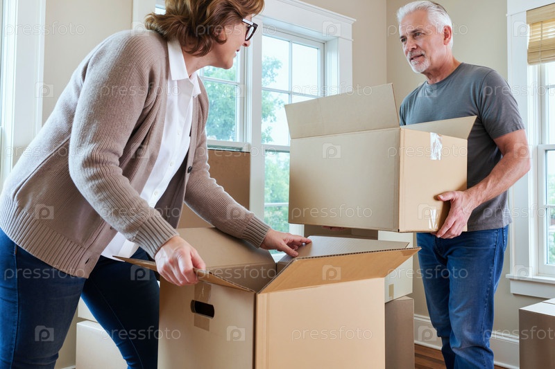 Кавказская пара средних лет собирает коробки для переезда вместе в светлой комнате