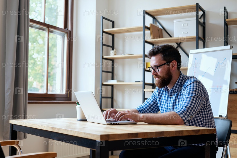 Кавказский молодой взрослый мужчина работает на ноутбуке в современной офисной среде