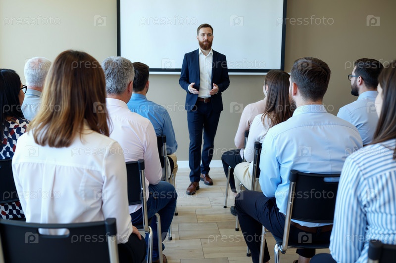 Кавказский молодой взрослый мужчина ведущий бизнес-семинар для разнообразной аудитории