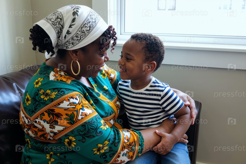 Чернокожая женщина средних лет улыбается молодому черному мальчику, сидящему на коленях в помещении