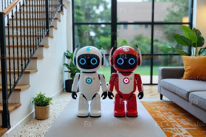 Два гуманоидных робота, стоящих вместе в современной среде гостиной