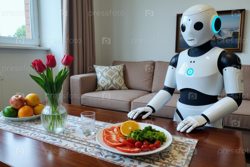 Гуманоидный робот сидит за столом, готовя здоровую еду из фруктов и овощей