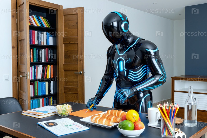 Футуристический робот пишет записки, стоя за офисным столом с закусками