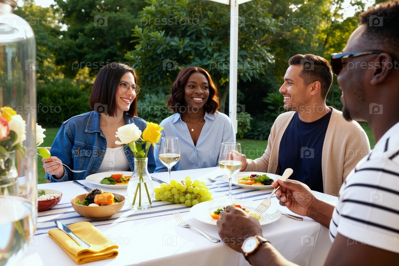 Мультиэтнические молодые взрослые, наслаждающиеся ужином на свежем воздухе, собираются за летним столом
