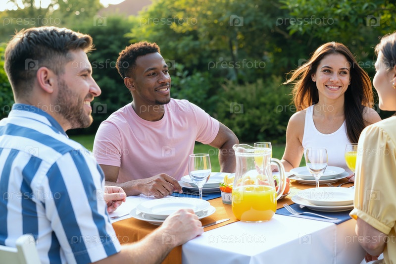 Группа молодых взрослых, общающихся на открытом воздухе во время летнего собрания