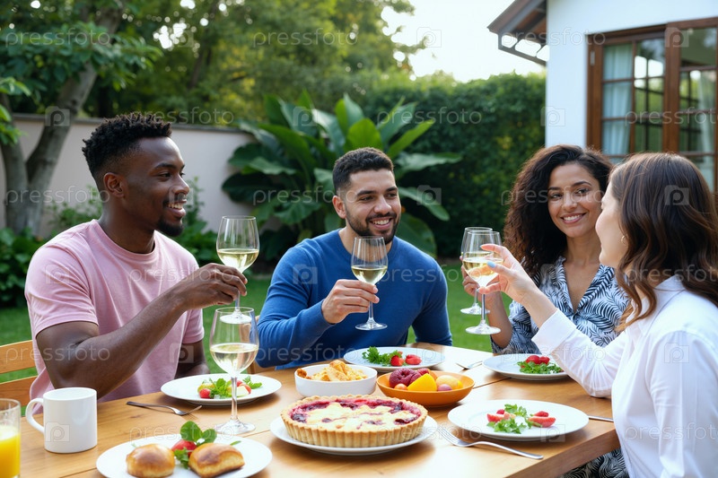 Группа молодых мультиэтнических взрослых, наслаждающихся едой на свежем воздухе и тостами вместе