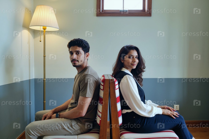 Молодой взрослый мужчина и женщина с Ближнего Востока сидят спиной к спине в помещении