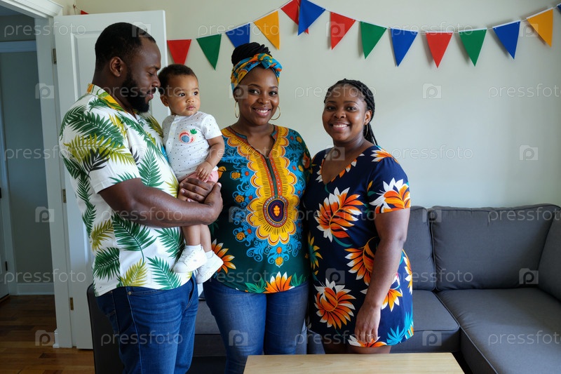 Черная семья собирается, улыбаясь вместе в помещении во время праздничного торжества
