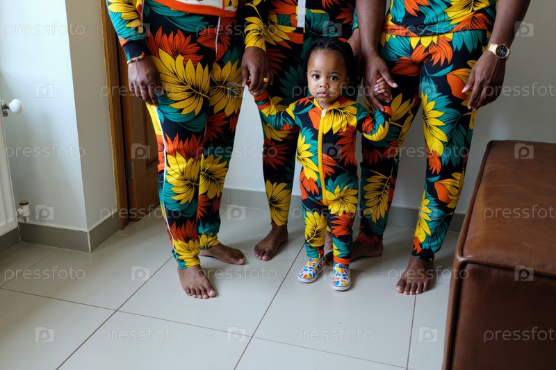 Молодая чернокожая девушка стоит с членами семьи, одетыми в соответствующие наряды