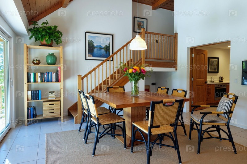 Столовая с деревянным столом и стульями в современном интерьере яркого дома