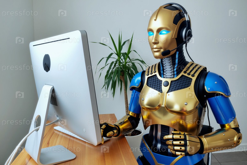 Футуристический женский робот использует настольный компьютер, нося гарнитуру в помещении