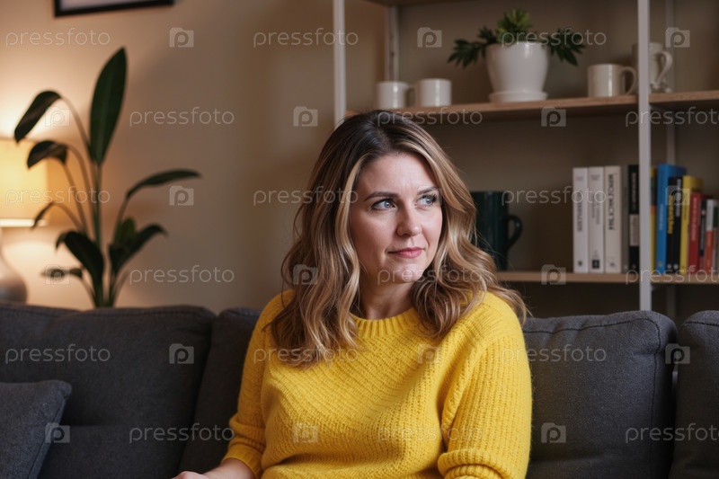 Кавказская женщина среднего возраста сидит в помещении, задумчиво оглядываясь