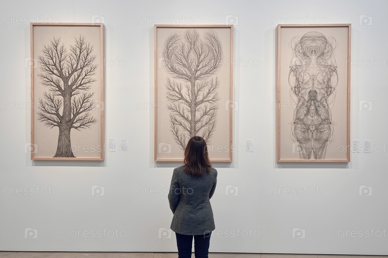 Молодая взрослая белая женщина наблюдает за ботаническими произведениями искусства в современной галерее