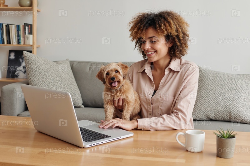 Молодая взрослая чернокожая женщина улыбается, работая на ноутбуке с маленькой собакой