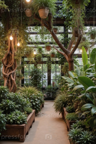 Прекрасный ботанический сад в помещении с обильной зеленью и висящими растениями
