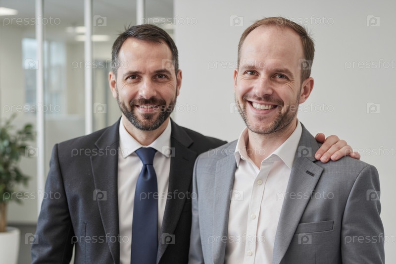 Портрет двух белых мужчин среднего возраста, улыбающихся вместе в офисной обстановке