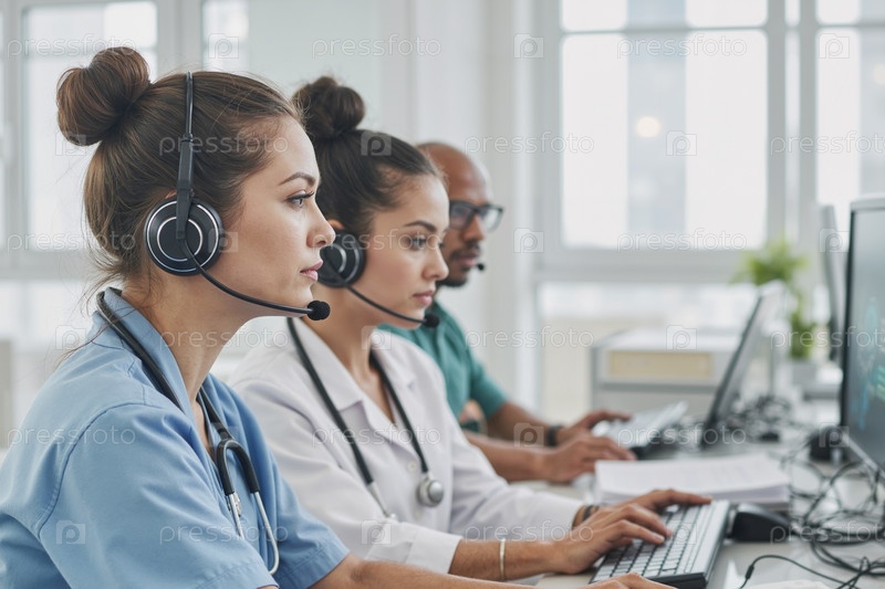 Молодые взрослые многоэтнические медицинские специалисты, работающие в центре поддержки клиентов