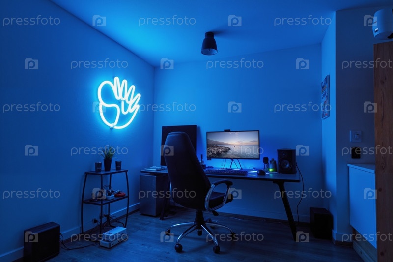 Домашний офис с современным компьютерным столом и неоновой настенной художественной иллюминационной комнатой
